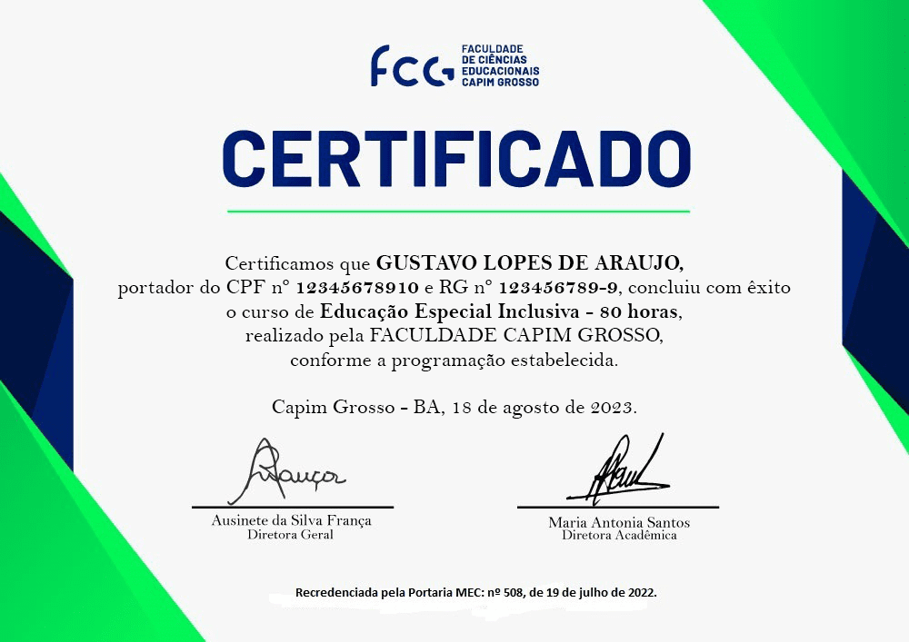 Os certificados são emitidos pela Faculdade Capim Grosso, que é nota máxima no MEC. Os certificados dos cursos livres da Faculdade FCG são Certificados de Extensão Universitária, sendo válidos tanto para o mercado profissional, quanto como atividade complementar em cursos de graduação, de acordo com as normativas do MEC.